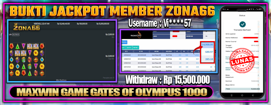 KEMENANGAN! MEMBER ZONA66 MERAIH MAXWIN GAME GATES of OLYMPUS 1000! 08 OCTOBER 2025