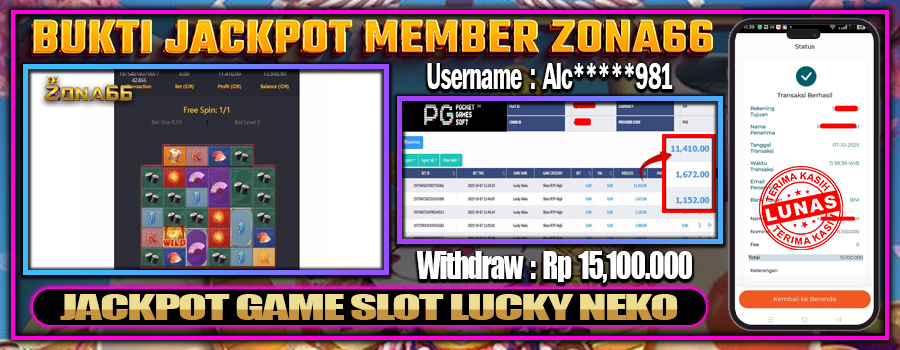 KEMENANGAN! MEMBER ZONA66 MERAIH JACKPOT SLOT LUCKY NEKO! 07 OCTOBER 2025