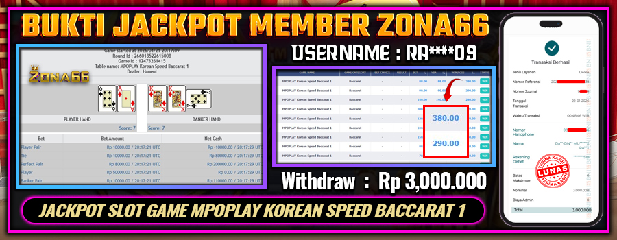 Kami ingin mengucapkan SELAMAT kepada para member setia ZONA66 yang berhasil meraih kemenangan luar biasa! 💰🔥 Keberuntungan dan strategi hebat kalian telah membawa hasil yang memuaskan. Salah satu member setia dengan User ID : RA****09 berhasil mendapatkan kemenangan besar di MPOPLAY permainan KOREAN SPEED BACCARAT 1 dengan total kemenangan mencapai Rp 3.000.000++! 😍💸