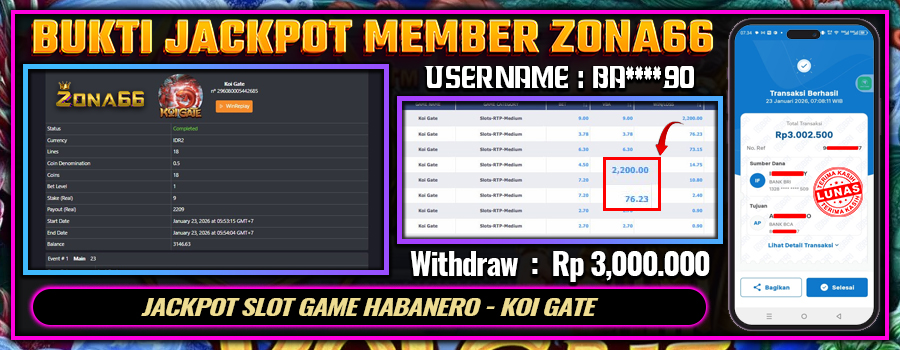 Kami ingin mengucapkan SELAMAT kepada para member setia ZONA66 yang berhasil meraih kemenangan luar biasa! 💰🔥 Keberuntungan dan strategi hebat kalian telah membawa hasil yang memuaskan. Salah satu member setia dengan User ID : BA****90 berhasil mendapatkan kemenangan besar di HABANERO permainan KOI GATE dengan total kemenangan mencapai Rp 3.000.000++! 😍💸
