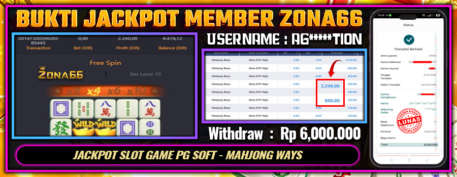 Kami ingin mengucapkan SELAMAT kepada para member setia ZONA66 yang berhasil meraih kemenangan luar biasa! 💰🔥 Keberuntungan dan strategi hebat kalian telah membawa hasil yang memuaskan. Salah satu member setia dengan User ID : AG*****TION berhasil mendapatkan kemenangan besar di PG SOFT permainan MAHJONG WAYS dengan total kemenangan mencapai Rp 6.000.000++! 😍💸