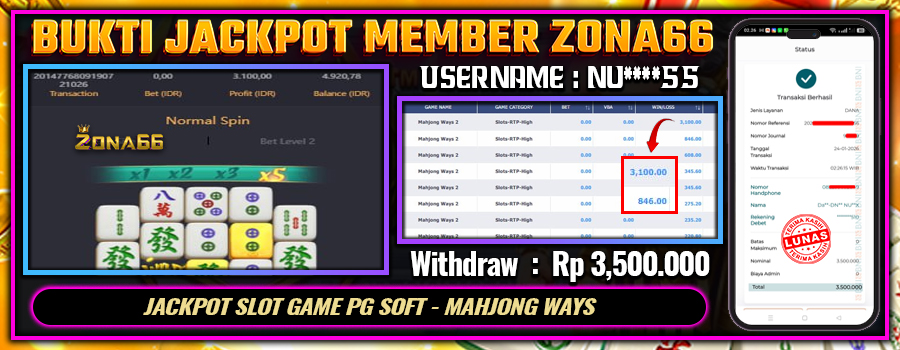 Kami ingin mengucapkan SELAMAT kepada para member setia ZONA66 yang berhasil meraih kemenangan luar biasa! 💰🔥 Keberuntungan dan strategi hebat kalian telah membawa hasil yang memuaskan. Salah satu member setia dengan User ID : NU****55 berhasil mendapatkan kemenangan besar di PG SOFT permainan MAHJONG WAYS dengan total kemenangan mencapai Rp 3.500.000++! 😍💸