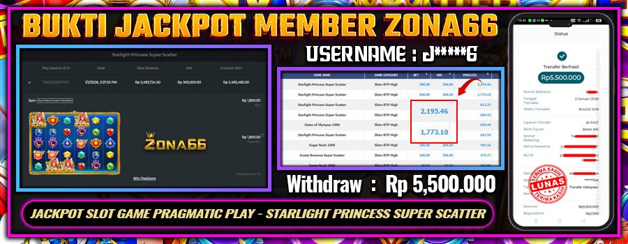 KEMENANGAN! MEMBER ZONA66 MERAIH MAXWIN GAME PRAGMATIC PLAY – STARLIGHT PRINCESS SUPER SCATTER! 02 JANUARY 2026