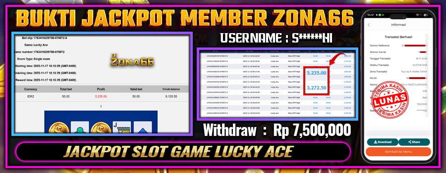 KEMENANGAN! MEMBER ZONA66 MERAIH JACKPOT LUCKY ACE! 18 NOVEMBER 2025