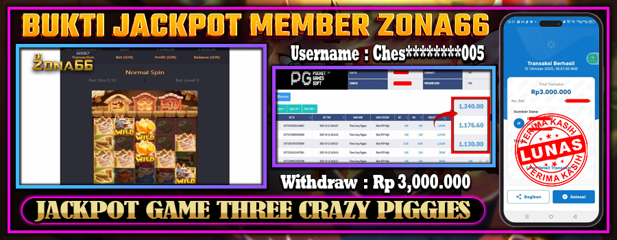 KEMENANGAN! MEMBER ZONA66 MERAIH JACKPOT THREE CRAZY PIGGIES! 13 OCTOBER 2025