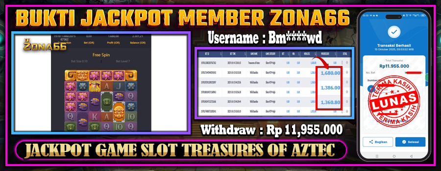 KEMENANGAN! MEMBER ZONA66 MERAIH JACKPOT SLOT TREASURES of AZTEC! 15 OCTOBER 2025