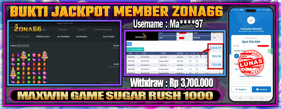 KEMENANGAN! MEMBER ZONA66 MERAIH MAXWIN GAME SUGAR RUSH 1000! 08 OCTOBER 2025
