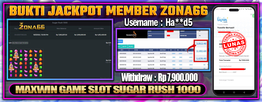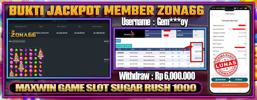 KEMENANGAN! MEMBER ZONA66 MERAIH MAXWIN GAME SUGAR RUSH 1000! 08 OCTOBER 2025