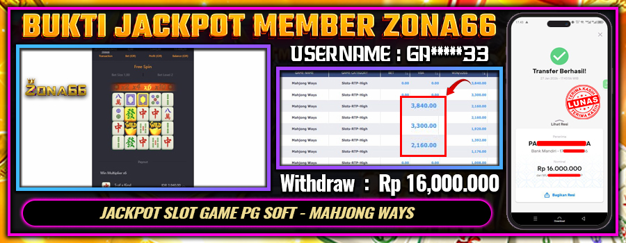 Kami ingin mengucapkan SELAMAT kepada para member setia ZONA66 yang berhasil meraih kemenangan luar biasa! 💰🔥 Keberuntungan dan strategi hebat kalian telah membawa hasil yang memuaskan. Salah satu member setia dengan User ID : GA*****33 berhasil mendapatkan kemenangan besar di PG SOFT permainan MAHJONG WAYS dengan total kemenangan mencapai Rp 16.000.000++! 😍💸