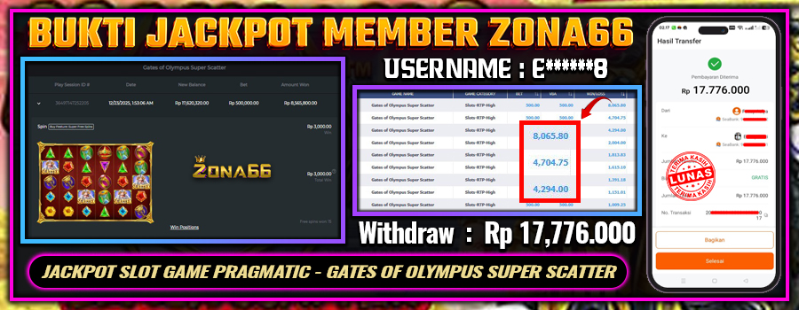 Kami ingin mengucapkan SELAMAT kepada para member setia ZONA66 yang berhasil meraih kemenangan luar biasa! 💰🔥 Keberuntungan dan strategi hebat kalian telah membawa hasil yang memuaskan. Salah satu member setia dengan User ID : e******8 berhasil mendapatkan kemenangan besar di PRAGMATIC PLAY permainan GATES OF OLYMPUS SUPER SCATTER dengan total kemenangan mencapai Rp 17.776.000++! 😍💸