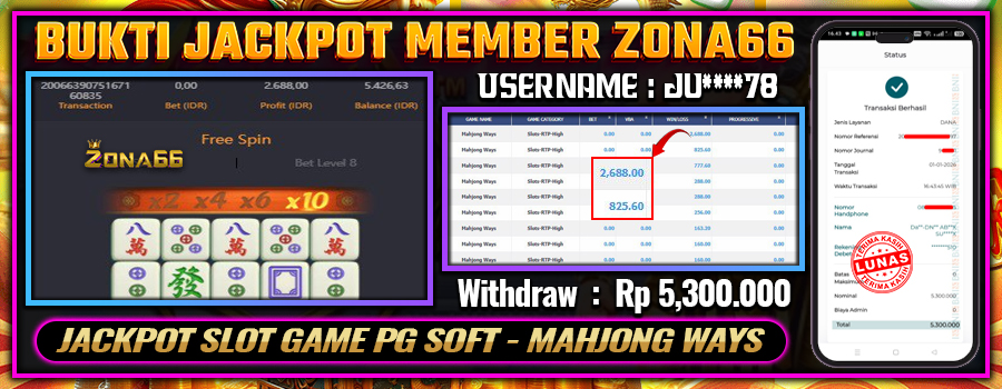 Kami ingin mengucapkan SELAMAT kepada para member setia ZONA66 yang berhasil meraih kemenangan luar biasa! 💰🔥 Keberuntungan dan strategi hebat kalian telah membawa hasil yang memuaskan. Salah satu member setia dengan User ID : JU****78 berhasil mendapatkan kemenangan besar di PG SOFT permainan MAHJONG WAYS dengan total kemenangan mencapai Rp 5.300.000++! 😍💸