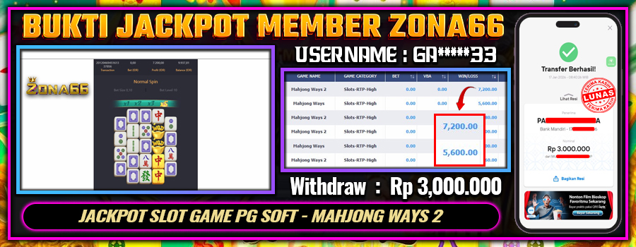 Kami ingin mengucapkan SELAMAT kepada para member setia ZONA66 yang berhasil meraih kemenangan luar biasa! 💰🔥 Keberuntungan dan strategi hebat kalian telah membawa hasil yang memuaskan. Salah satu member setia dengan User ID : GA*****33 berhasil mendapatkan kemenangan besar di PG SOFT permainan MAHJONG WAYS 2 dengan total kemenangan mencapai Rp 3.000.000++! 😍💸