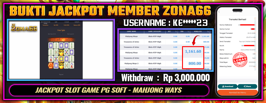 Kami ingin mengucapkan SELAMAT kepada para member setia ZONA66 yang berhasil meraih kemenangan luar biasa! 💰🔥 Keberuntungan dan strategi hebat kalian telah membawa hasil yang memuaskan. Salah satu member setia dengan User ID : KE*****23 berhasil mendapatkan kemenangan besar di PG SOFT permainan MAHJONG WAYS dengan total kemenangan mencapai Rp 3.000.000++! 😍💸