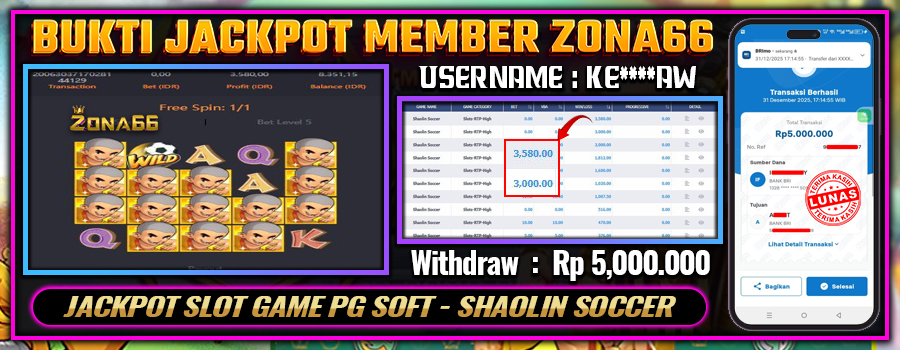 Kami ingin mengucapkan SELAMAT kepada para member setia ZONA66 yang berhasil meraih kemenangan luar biasa! 💰🔥 Keberuntungan dan strategi hebat kalian telah membawa hasil yang memuaskan. Salah satu member setia dengan User ID : KE****AW berhasil mendapatkan kemenangan besar di PG SOFT permainan SHAOLIN SOCCER dengan total kemenangan mencapai Rp 5.000.000++! 😍💸