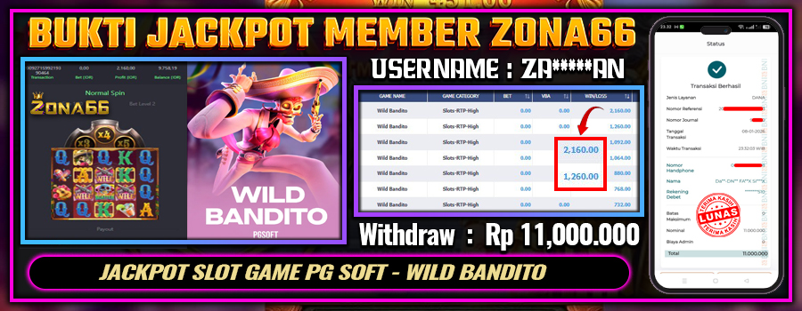 Kami ingin mengucapkan SELAMAT kepada para member setia ZONA66 yang berhasil meraih kemenangan luar biasa! 💰🔥 Keberuntungan dan strategi hebat kalian telah membawa hasil yang memuaskan. Salah satu member setia dengan User ID : ZA*****AN berhasil mendapatkan kemenangan besar di PG SOFT permainan WILD BANDITO dengan total kemenangan mencapai Rp 11.000.000++! 😍💸