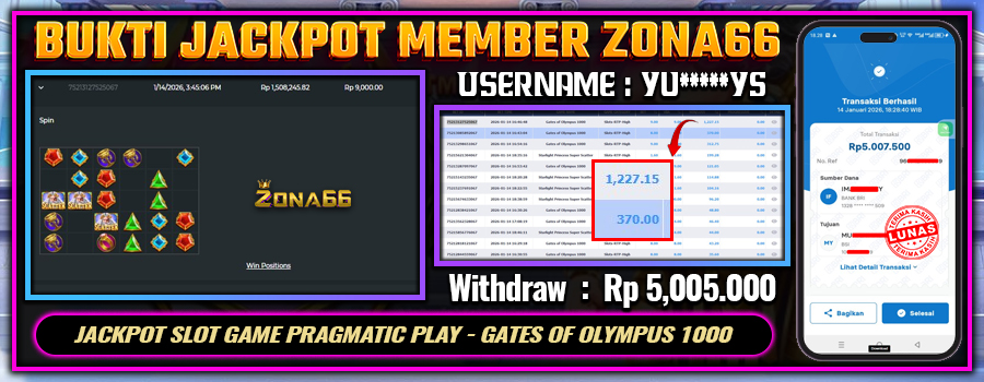 Kami ingin mengucapkan SELAMAT kepada para member setia ZONA66 yang berhasil meraih kemenangan luar biasa! 💰🔥 Keberuntungan dan strategi hebat kalian telah membawa hasil yang memuaskan. Salah satu member setia dengan User ID : YU*****YS berhasil mendapatkan kemenangan besar di PRAGMATIC PLAY permainan GATES OF OLYMPUS 1000 dengan total kemenangan mencapai Rp 5.005.000++! 😍💸