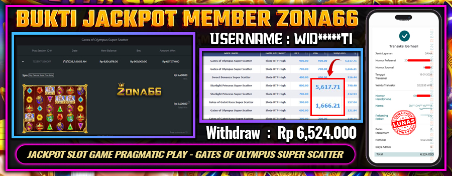 Kami ingin mengucapkan SELAMAT kepada para member setia ZONA66 yang berhasil meraih kemenangan luar biasa! 💰🔥 Keberuntungan dan strategi hebat kalian telah membawa hasil yang memuaskan. Salah satu member setia dengan User ID : WID*****TI berhasil mendapatkan kemenangan besar di PRAGMATIC PLAY permainan GATES OF OLYMPUS SUPER SCATTER dengan total kemenangan mencapai Rp 6.524.000++! 😍💸