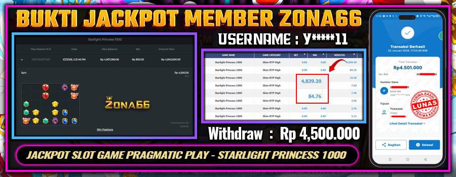 Kami ingin mengucapkan SELAMAT kepada para member setia ZONA66 yang berhasil meraih kemenangan luar biasa! 💰🔥 Keberuntungan dan strategi hebat kalian telah membawa hasil yang memuaskan. Salah satu member setia dengan User ID : Y*****11 berhasil mendapatkan kemenangan besar di PRAGMATIC PLAY permainan STARLIGHT PRINCESS 1000 dengan total kemenangan mencapai Rp 4.500.000++! 😍💸