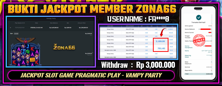 Kami ingin mengucapkan SELAMAT kepada para member setia ZONA66 yang berhasil meraih kemenangan luar biasa! 💰🔥 Keberuntungan dan strategi hebat kalian telah membawa hasil yang memuaskan. Salah satu member setia dengan User ID : FA****8 berhasil mendapatkan kemenangan besar di PRAGMATIC PLAY permainan VAMPY PARTY dengan total kemenangan mencapai Rp 3.000.000++! 😍💸