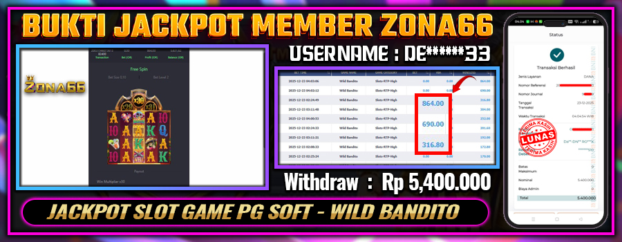 Kami ingin mengucapkan SELAMAT kepada para member setia ZONA66 yang berhasil meraih kemenangan luar biasa! 💰🔥 Keberuntungan dan strategi hebat kalian telah membawa hasil yang memuaskan. Salah satu member setia dengan User ID : de******33 berhasil mendapatkan kemenangan besar di PG SOFT permainan WILD BANDITO dengan total kemenangan mencapai Rp 5.400.000++! 😍💸