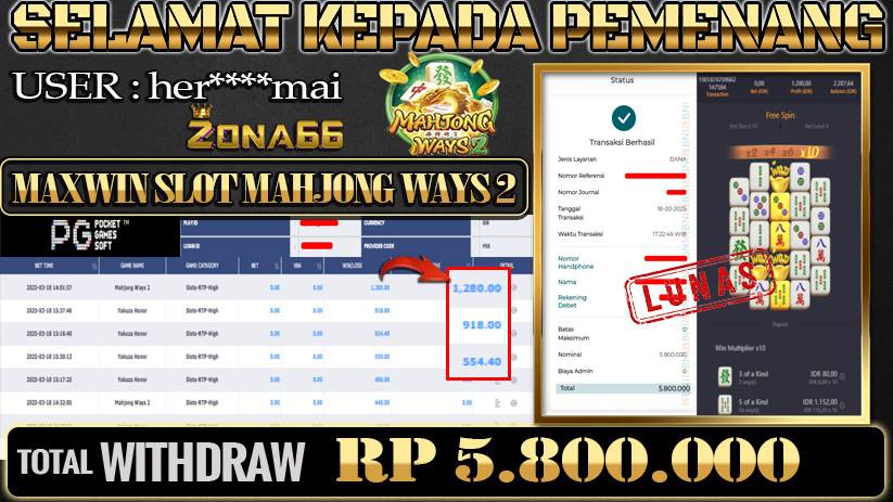 LUAR BIASA! MEMBER ZONA66 MERAIH KEMENANGAN DI MAHJONG WAYS 2! 18 MARET 2025