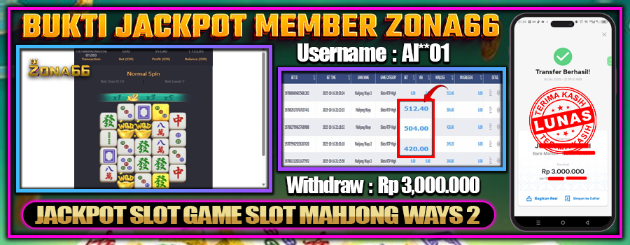 Kami ingin mengucapkan SELAMAT kepada para member setia ZONA66 yang berhasil meraih kemenangan luar biasa! 💰🔥 Keberuntungan dan strategi hebat kalian telah membawa hasil yang memuaskan. Salah satu member setia dengan User ID : Al**01 berhasil mendapatkan kemenangan besar di PG SOFT permainan MAHJONG WAYS 2 dengan total kemenangan mencapai Rp 3.000.000++! 😍💸