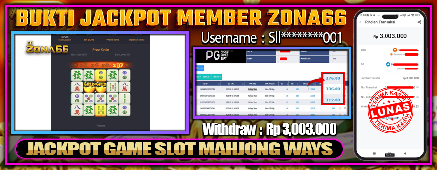 Kami ingin mengucapkan SELAMAT kepada para member setia ZONA66 yang berhasil meraih kemenangan luar biasa! 💰🔥 Keberuntungan dan strategi hebat kalian telah membawa hasil yang memuaskan. Salah satu member setia dengan User ID : Sll*********001 berhasil mendapatkan kemenangan besar di PG SOFT permainan MAHJONG WAYS dengan total kemenangan mencapai Rp 3.003.000++! 😍💸