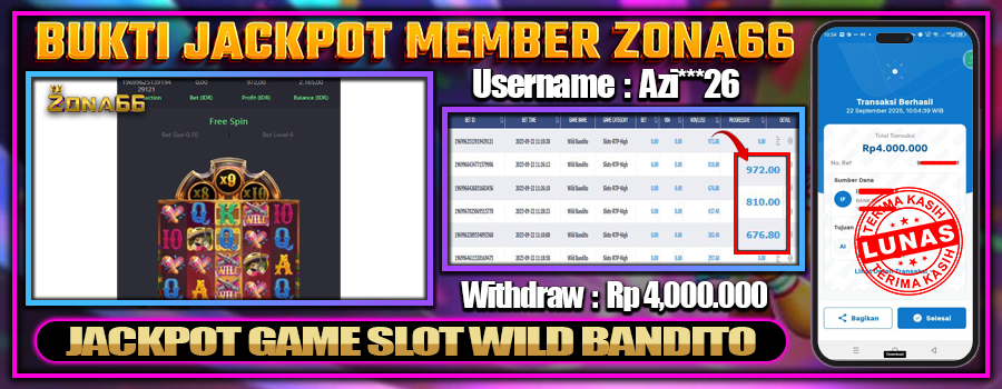 Kami ingin mengucapkan SELAMAT kepada para member setia ZONA66 yang berhasil meraih kemenangan luar biasa! 💰🔥 Keberuntungan dan strategi hebat kalian telah membawa hasil yang memuaskan. Salah satu member setia dengan User ID : Azi***26 berhasil mendapatkan kemenangan besar di PGSOFT permainan WILD BANDITO dengan total kemenangan mencapai Rp 4.000.000++! 😍💸