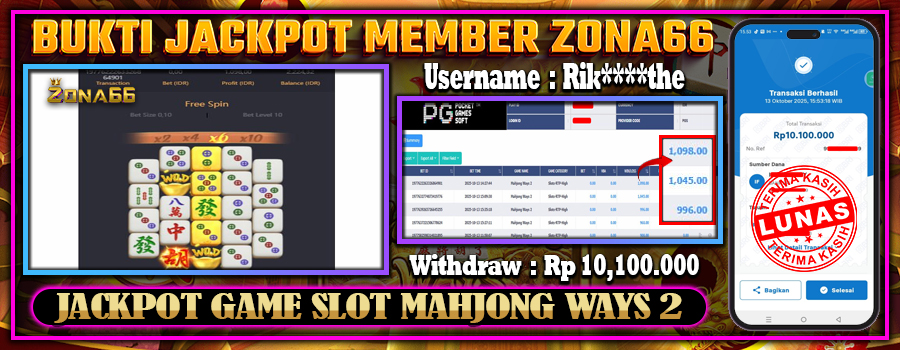 Kami ingin mengucapkan SELAMAT kepada para member setia ZONA66 yang berhasil meraih kemenangan luar biasa! 💰🔥 Keberuntungan dan strategi hebat kalian telah membawa hasil yang memuaskan. Salah satu member setia dengan User ID : Rik****the berhasil mendapatkan kemenangan besar di PGSOFT permainan MAHJONG WAYS dengan total kemenangan mencapai Rp 10.100.000++! 😍💸