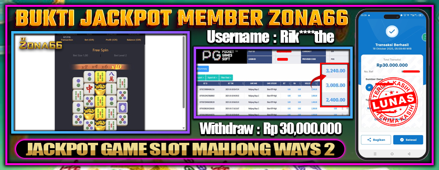 Kami ingin mengucapkan SELAMAT kepada para member setia ZONA66 yang berhasil meraih kemenangan luar biasa! 💰🔥 Keberuntungan dan strategi hebat kalian telah membawa hasil yang memuaskan. Salah satu member setia dengan User ID : Rik****the berhasil mendapatkan kemenangan besar di PG SOFT permainan MAHJONG WAYS 2 dengan total kemenangan mencapai Rp 30.000.000++! 😍💸