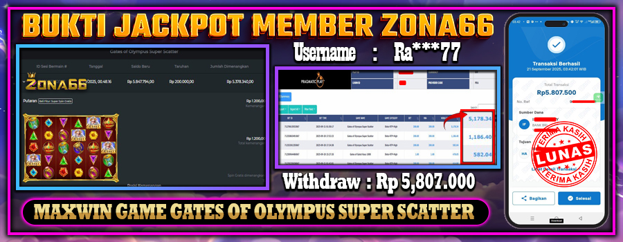 Kami ingin mengucapkan SELAMAT kepada para member setia ZONA66 yang berhasil meraih kemenangan luar biasa! 💰🔥 Keberuntungan dan strategi hebat kalian telah membawa hasil yang memuaskan. Salah satu member setia dengan User ID : Ra***77 berhasil mendapatkan kemenangan besar di PRAGMATIC PLAY permainan GATES OF OLYMPUS SUPER SCATTER dengan total kemenangan mencapai Rp 5.807.000++! 😍💸