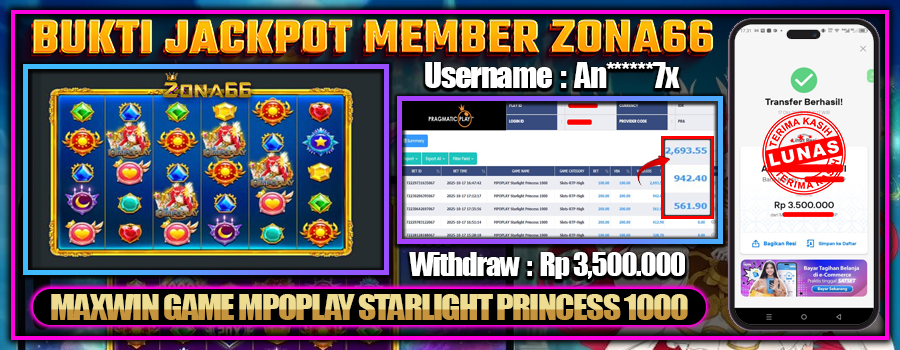 Kami ingin mengucapkan SELAMAT kepada para member setia ZONA66 yang berhasil meraih kemenangan luar biasa! 💰🔥 Keberuntungan dan strategi hebat kalian telah membawa hasil yang memuaskan. Salah satu member setia dengan User ID : An******7x berhasil mendapatkan kemenangan besar di PRAGMATIC PLAY permainan MPOPLAY STARLIGHT PRINCESS 1000 dengan total kemenangan mencapai Rp 3.500.000++! 😍💸