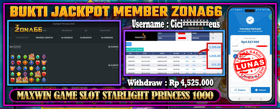 Kami ingin mengucapkan SELAMAT kepada para member setia ZONA66 yang berhasil meraih kemenangan luar biasa! 💰🔥 Keberuntungan dan strategi hebat kalian telah membawa hasil yang memuaskan. Salah satu member setia dengan User ID : Cici********eus berhasil mendapatkan kemenangan besar di PRAGMATIC PLAY permainan STARLIGHT PRINCESS 1000 dengan total kemenangan mencapai Rp 4.525.000++! 😍💸