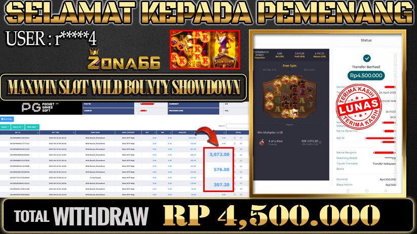 Kami ingin mengucapkan SELAMAT kepada para member setia ZONA66 yang berhasil meraih kemenangan luar biasa! 💰🔥 Keberuntungan dan strategi hebat kalian telah membawa hasil yang memuaskan. Salah satu member setia dengan User ID : R*****4 berhasil mendapatkan kemenangan besar di PG SOFT permainan WILD BOUNTY SHOWDOWN dengan total kemenangan mencapai Rp 4.500.000++! 😍💸