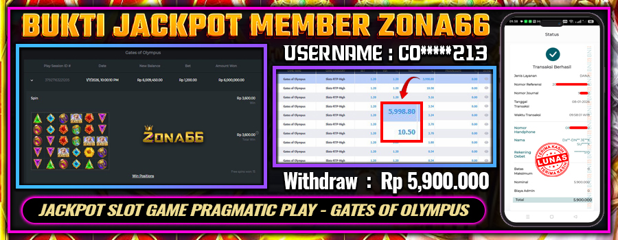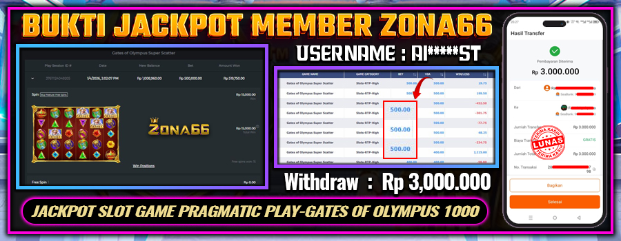 KEMENANGAN! MEMBER ZONA66 MERAIH MAXWIN GAME PRAGMATIC PLAY – GATES OF OLYMPUS 1000! 06 JANUARY 2026