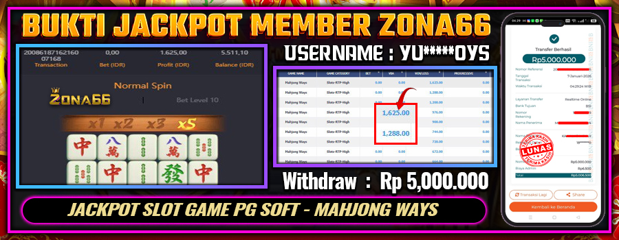 KEMENANGAN! MEMBER ZONA66 MERAIH MAXWIN GAME PG SOFT – MAHJONG WAYS 2! 05 JANUARY 2026